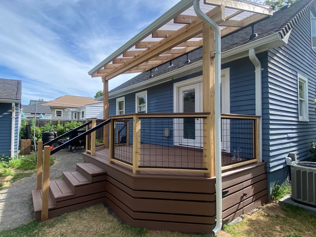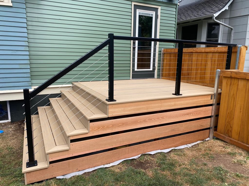 In Laker Oswego, we completely refurbished this older deck. We added Trex RainEscape to the upper levels. The stainless steel cable and cedar framed handrail almost disappear.