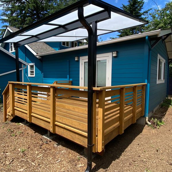 Elevate your outdoor space with this beautifully crafted gable-style patio cover. Featuring pressure-treated posts and beams wrapped in cedar and complemented by sturdy cedar rafters, this design combines strength with natural beauty. The ACRYLITE Wave panel roof offers exceptional durability allowing natural lite to shine through.